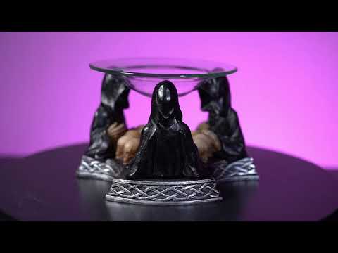 ガラス皿付きの不気味なグリムリーパーオイルバーナー。頭蓋骨に囲まれたティアライトホルダー。ベースエッジの周りにケルトの結び目パターンが特徴です。