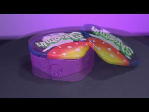 - 「shroomin」のフレーズのある笑顔の赤いキノコが特徴