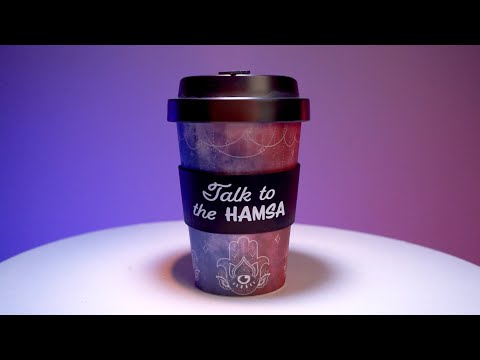 - Matching black anti-spill lid and protective silicone band with punny phrase 'Talk to the Hamsa'.