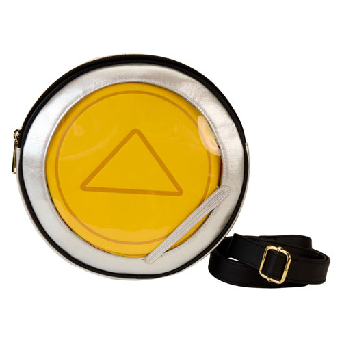 Capture iconic moments from the Netflix series with this accessory, which showcases the Dalgana Candy challenge. This fully figural bag, in the circular shape of a candy tin, holds a reversible and detachable yellow coin bag. The coin bag displays the umbrella shape on one side, and a triangle on the other. Silver metallic faux leather adds extra sparkle, along with clear PVC material on the front. A die-cut applique of the cutting utensil for this game adds a realistic detail. Pack your daily essentials and take on any challenge in style.