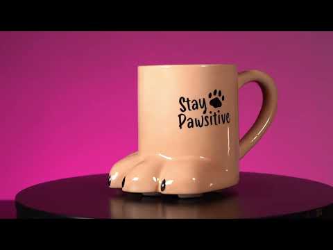 Bedårende 3D -krus formet som en kattes labb. Purr-Fect for Cat Lover i livet ditt! Med grå aksenter og en punny -setning som leser 'Stay Pawsitive'.