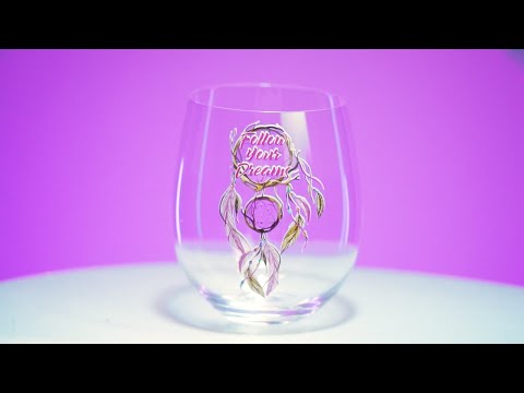 - 気まぐれなドリームキャッチャーをフィーチャーした手吹きのステムレスワイングラス「フォローあなたの夢」。